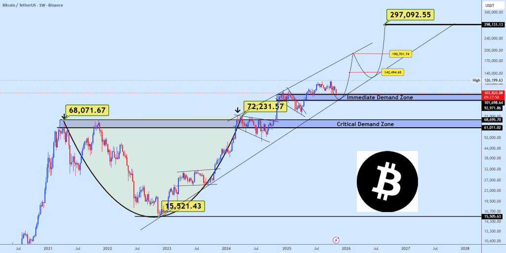 ناحیه ۹۲ تا ۱۰۱ هزار دلاری، همچنان منطقه مورد علاقه فوریه، جایی که اگه تست بشه، انتظار داریم خریدارا دوباره دامیننس (تسلط) رو به دست بیارن. حفظ شدن بالای این ساختار، بازار رو برای یه موج صعودی (انبساطی) دیگه که هدفش ۱۴۲ تا ۱۹۰ هزار دلاره، آماده نگه میداره، و پیشبینی نهایی هم اینه که تو مرحله صعودی (bullish leg) اصلی بعدی، تا محدوده ۲۹۷ هزار دلار گسترش پیدا کنه.