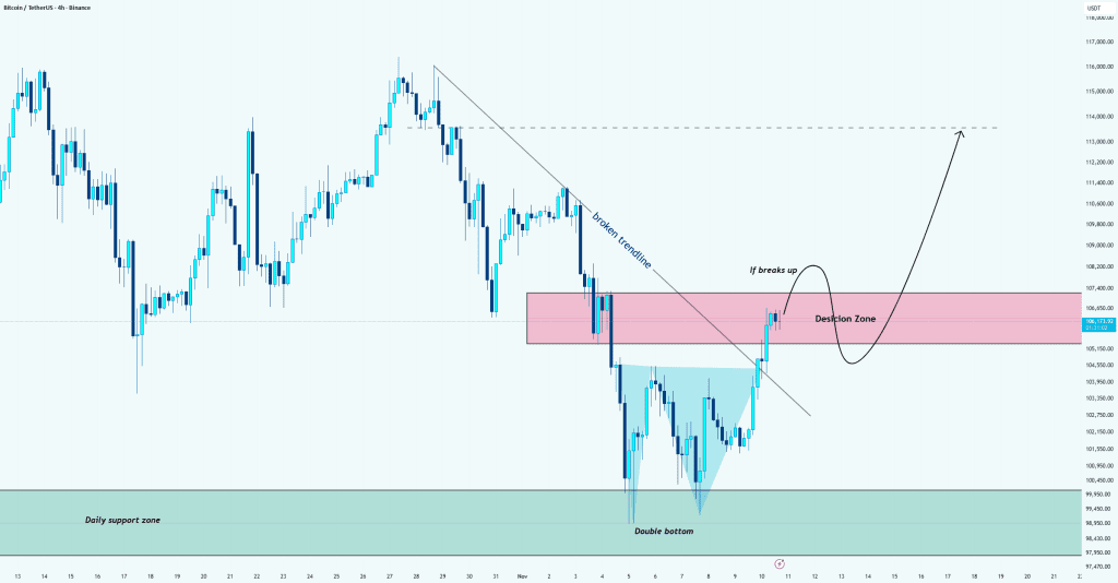 قیمت الان داره به منطقه تصمیم نزدیک میشه، یه ناحیه عرضه کلیدی که ریزش قبلی از اونجا شروع شد. این منطقه مشخص میکنه که این ریکاوری فعلی فقط یه واکنش معمولیه یا شروع یه ادامه روند صعودی بزرگتر.