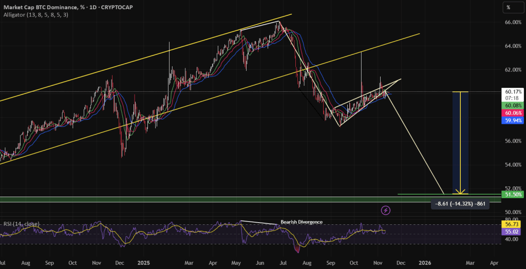 دامیننس بیت کوین کانال صعودی هفتگی رو بعد از اینکه یک واگرایی نزولی تشکیل داد، شکست. در حال حاضر، یک الگوی کنج صعودی (rising wedge) ساخته، که یک سقوط بزرگ رو نشون میده، با اهداف ۵۱ درصدی بر اساس پیشبینیهای کنج. این یعنی آلتکوینها یه پامپ حسابی خواهند داشت.