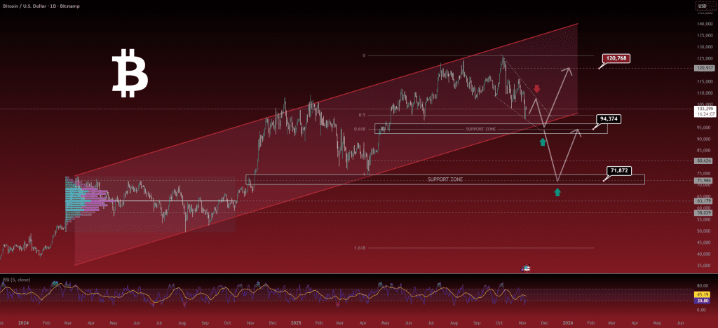 – حد پایینی (حمایت): همگرا میشه با خط روند D1 و محدوده اصلاح فیبوناچی ۰.۶۱۸، که بین ۹۴,۰۰۰ دلار تا ۹۵,۰۰۰ دلار قرار داره