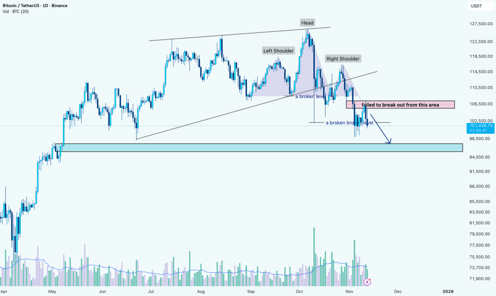 بیت کوین یه الگوی سر و شانه کاملاً واضح رو تو چارت روزانه تایید کرده، که از خط گردنش شکسته و اون ساختار رو به عنوان مقاومت دوباره تست کرده. قیمت تلاش کرد سطح شکسته شده رو پس بگیره ولی نتونست از محدوده رد شدن (ریجکشن) خارج بشه، که نشون میده فعلاً فروشندهها کنترل رو دارن.