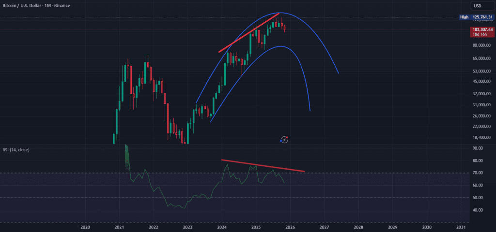 بیت کوین داره همون روند سقفسازی سالهای ۲۰۲۱-۲۲ رو تکرار میکنه. رالی گاوی تموم شده و سقف توی سپتامبر بود. حالا یه روند فرسایشی کند یا سقوط آزاد رو میبینیم. با برگشت منفی بزرگ توی RSI ماهانه، خیلی نزولی به نظر میرسه. این چارت واقعاً زشته! باید ببینیم بیت کوین داره یه سقف موز شکل (banana top) میسازه، پس اگه قیمت به سقفهای بالاتری بره این باطل میشه، ولی احتمالاً بازار گاوی تموم شده. منتظر یه اصلاح ۴۰-۵۰ درصدی باشید.