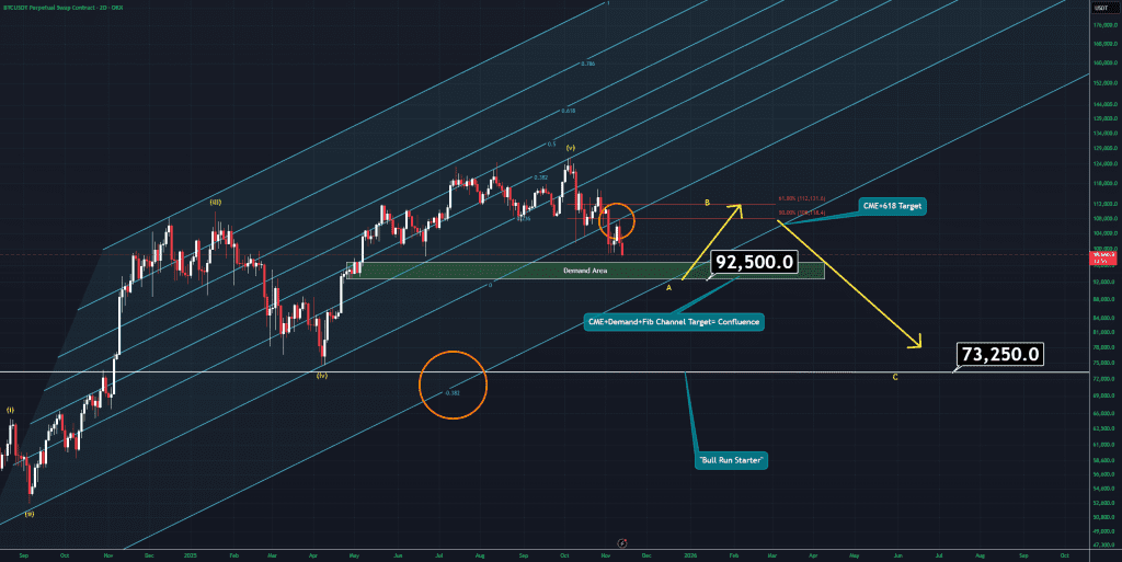 به زودی یه اصلاح تا ۱۱۰ هزار دلار رو میبینید ولی این فقط موج B خواهد بود. پس، اگه پوزیشنهای پوشش ریسک (هج) بلندمدت دارید، باید مراقب یه کندل روزانه پوشاننده (ENGULFING) تو بیت کوین حوالی ۹۲ هزار دلار باشید. اونجا جاییه که گپ CME جا مونده — همچنین یه ناحیه تقاضا و علاوه بر این، همگرایی کانال فیب وجود داره. قبل از اینکه اون “پوشاننده” اتفاق بیفته، پیشنهاد نمیکنم حد ضرر (بریک ایون) رو تو پوزیشنهای ضررده پایین بیارید.