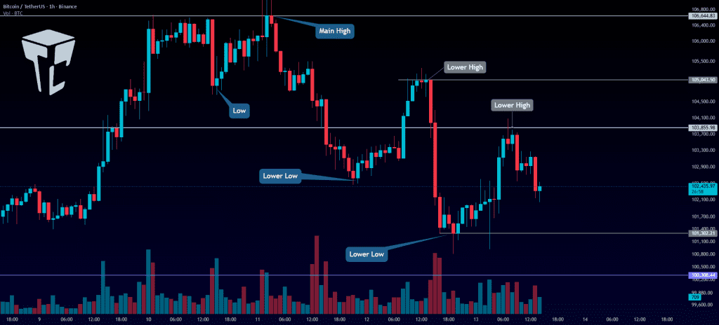 دیروز بیت کوین بعد از اینکه از سطح ۱۰۵۰۴۳ رد شد (ریجکت شد)، یه حرکت نزولی دیگه انجام داد و تا ۱۰۱۳۰۲ پایین اومد.