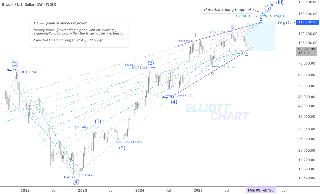 بر اساس این مدل کوانتومی (Q-Model)، رشد از آگوست ۲۰۲۴ ممکنه به شکل یک الگوی «Ending Diagonal» توی موج (۵) میانی دراومده باشه — که خودش توی ادامه روند صعودی اصلی در موج ⓹ قرار گرفته.
