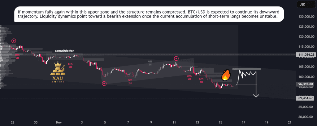 BTC/USD الان داره به یه منطقهای نزدیک میشه که از نظر تاریخی با دستکاریهای کوتاهمدت و جمعآوری نقدینگی همراه بوده. به نظر میاد قیمت داره یه تثبیت سفت و سخت رو تشکیل میده در حالی که داره به این منطقه میره بالا. چنین رفتاری اغلب قبل از ادامه فروش اتفاق میافته، مخصوصاً وقتی رالیها نتونن گسترش پیشروندهای نشون بدن.