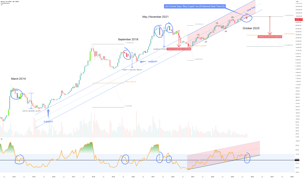 از همین الان (۲۳ اکتبر ۲۰۲۵) تا حدود یک هفته دیگه، نمودار ۳ هفتهای بیت کوین ممکنه یک کندل پوششی نزولی (دایرههای آبی) رو تأیید کنه، مگر اینکه قیمت به ۱۱۵ هزار دلار برگرده.