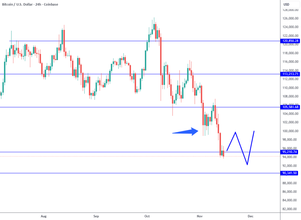 نمودار من سطوح کلیدی رو تو این تایم‌فریم خاص نشون می‌ده، فلش به یه نقطه واکنش (مقاومت جدید ۱۰۰ هزار) اشاره می‌کنه، و تصویر خطوط یه سناریوی احتمالی رو برجسته می‌کنه که من معتقدم احتمال رخ دادنش تو هفته یا هفته‌های آینده بیشتره. فعلاً حمایت ۹۵ هزار شکسته شده ولی نه خیلی زیاد، می‌تونه سریع برگرده. از اونجایی که چندین حمایت اصلی تو این ناحیه وجود داره، نکته اصلی اینه که یه الگوی برگشتی تأیید بشه. ممکنه به شکل یه کف ناموفق یا الگوی کف دو قلو نزدیک سطح ۹۰ هزار باشه. با توجه به اینکه حالا ناحیه ۱۰۰ هزار یه مقاومت جدیده، منطقیه که پتانسیل سود رو از اونجا اندازه‌گیری کنیم. این دیدگاه با افق زمانی کوتاه‌تر، فقط برای معاملات نوسانی ایده‌آله.