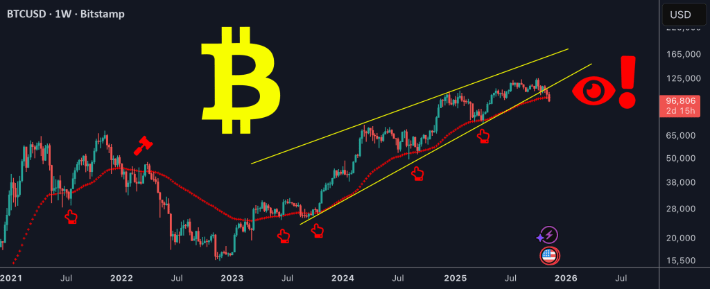 بیت کوین الان روی یه سطح حمایتی «مرگ و زندگی» (خط روند + میانگین متحرک ۵۰ هفته‌ای) قرار داره.