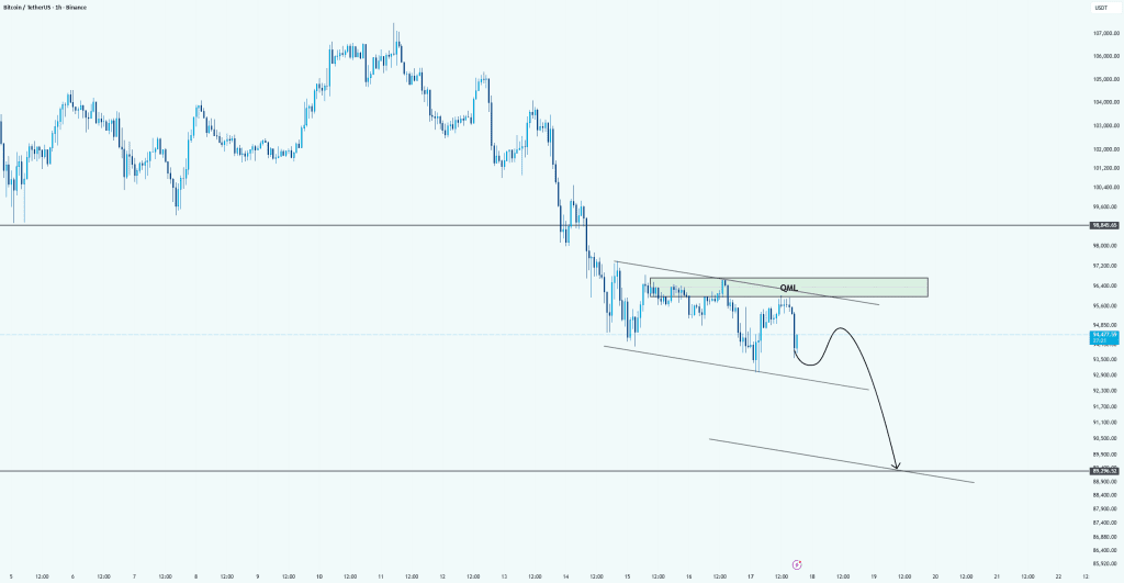 نمودار نشون میده که بیت کوین داره داخل یه کانال نزولی حرکت میکنه، سقفهای پایینتر و کفهای پایینتر پشت سر هم، یه روند نزولی کنترل شده رو تایید میکنه. حرکت اخیر قیمت سعی کرد برگرده به محدوده QML (سطح کازیمودو)، ولی واکنشی که اونجا دیدیم نشوندهنده یه رد شدن واضحه، که یعنی عرضه هنوز کنترل رو دستش داره.