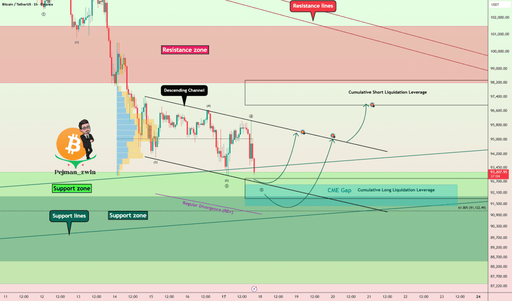 در حال حاضر، بیت کوین نزدیک منطقه حمایتی (۹۳,۲۰۰ دلار – ۸۷,۳۴۰ دلار) و خطوط حمایتی اصلی داره حرکت می‌کنه.