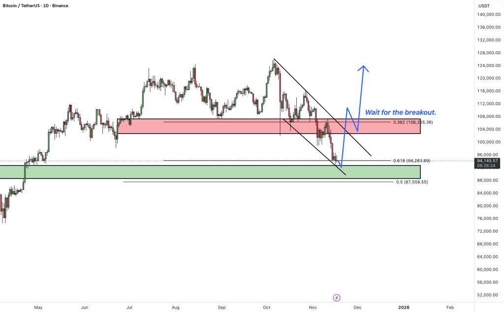 بیت کوین اومده تو محدوده حمایتی که مشخص شده، جایی که احتمالا یه واکنش صعودی تو کوتاه‌مدت خواهیم داشت. از این منطقه، ممکنه قیمت سعی کنه برگرده به سمت خط روند نزولی.