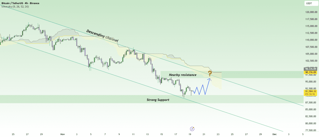 تو چارت ۴ ساعته، بیت کوین تو منطقه حمایت اصلی حدود ۹۰,۳۰۰ داره به شدت واکنش نشون میده. کف‌های اخیر دیگه عمیق‌تر نمیشن — یه نشونه واضح از اینکه فشار فروش داره ضعیف میشه. اگه قیمت بتونه بالای این سطح بمونه و به سمت مرز بالایی کانال نزولی حرکت کنه، بیت کوین میتونه به راحتی تا مقاومت نزدیک ۹۶,۳۰۰ بالا بره.