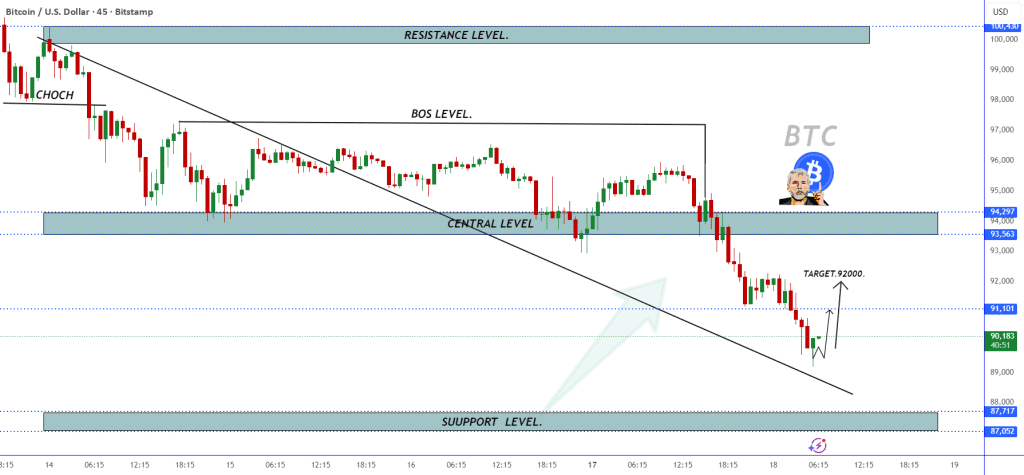 بیت کوین تو یه روند نزولی واضح داره معامله می‌شه، از سطح میانیش پایین‌تر رفته و داره به محدوده حمایتی نزدیک می‌شه. یه برگشت اصلاحی کوتاه‌مدت به سمت ۹۲,۰۰۰ بهش اشاره شده، ولی ساختار کلی هنوز فشار نزولی رو زیر مقاومت‌های اصلی و سطوح BOS نشون می‌ده.