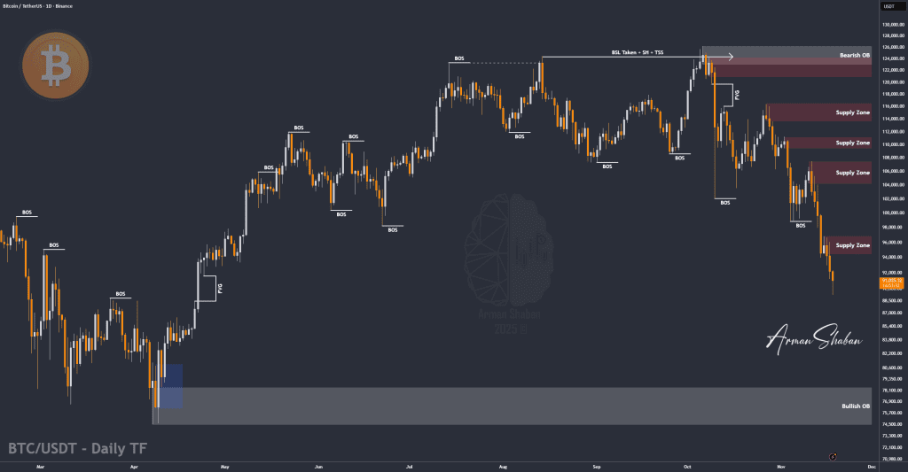 مناطق کلیدی عرضه و تقاضا رو تو چارت مشخص کردم. سطوح مهم تقاضا روی ۸۸,۰۰۰ دلار، ۸۴,۰۰۰ دلار و محدوده بزرگتر ۷۴,۰۰۰–۷۸,۰۰۰ دلار هستن. حواستون به واکنش قیمت تو این محدودهها باشه.