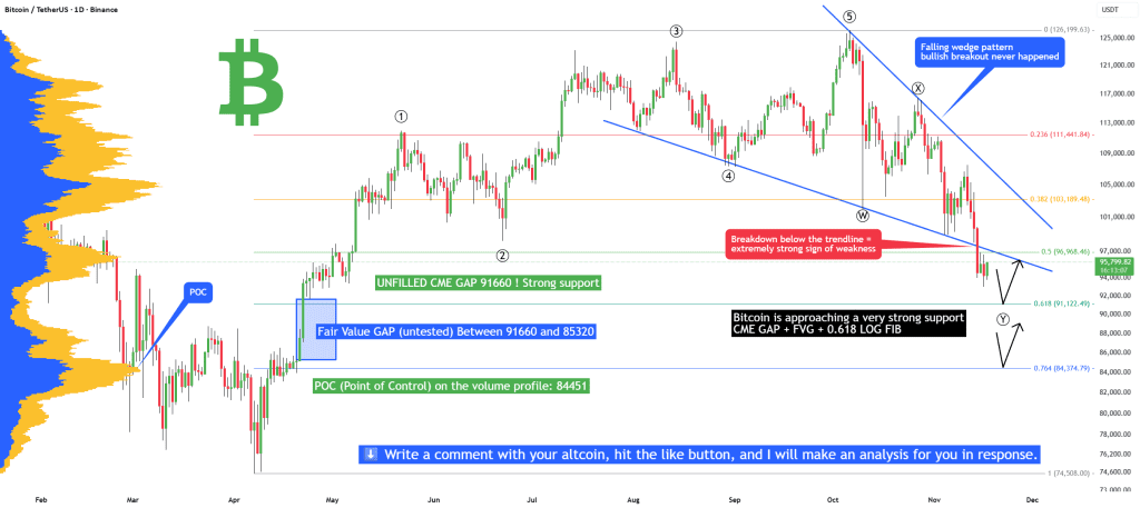 سطح حمایت کلیدی ۹۱ هزاره! چرا؟ ما اینجا یه همگرایی خیلی قوی برای خرید بیت کوین داریم، حداقل برای یه برگشت کوتاهمدت. اول از همه، یه گپ پر نشده فیوچرز CME تو چارت روزانه هست. دوم، یه FVG (Fair Value Gap) پر نشده بین ۹۱۶۶۰ و ۸۵۳۲۰ تو بایننس وجود داره. بعدی هم سطح فیبوناچی ۰.۶۱۸ تو مقیاس لگاریتمیه. این فیبو دقیقاً رو ۹۱۱۲۲ هست.