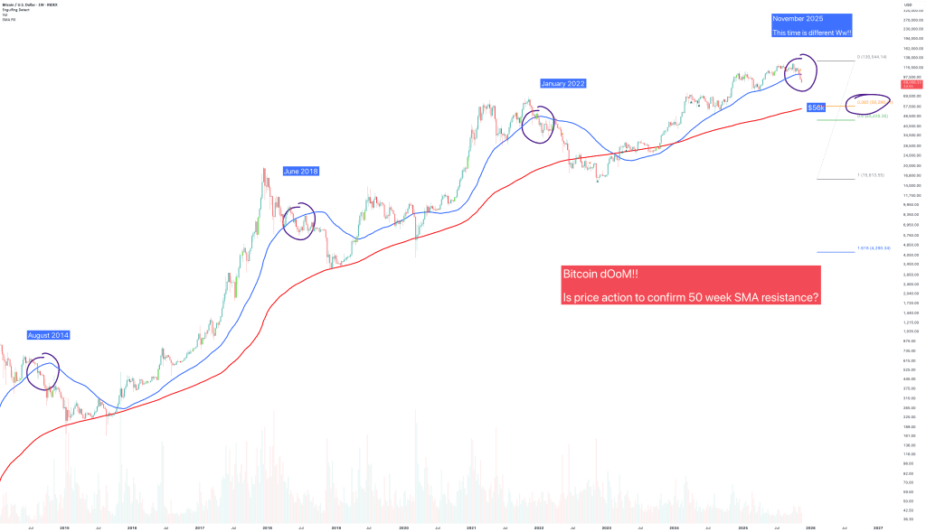 در تمام تاریخچه بیت کوین، هر بار که قیمت زیر ۵۰ week SMA بسته شده، یه تست از ۲۰۰ weekly SMA اتفاق افتاده. این یه واقعیت چارت هست و جای بحثی نداره. امروز این یعنی یه تست کاملاً قابل پیشبینی ۵۶ هزار دلاری، که همون فیبوناچی ۰.۳۸ هم هست.