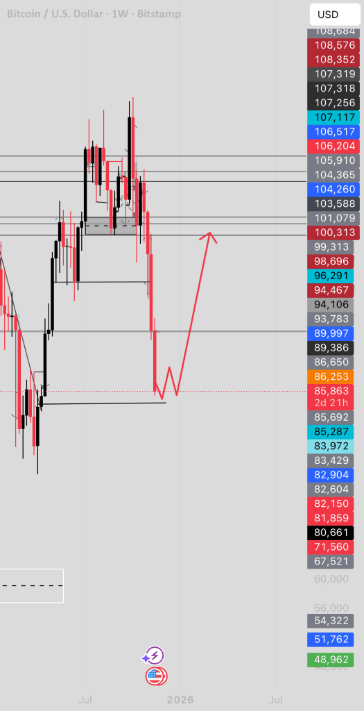 BTC نقدینگی سمت فروش هفتگی رو جارو کرده و داره میفته تو یه محدوده تخفیف HTF بزرگ. اگه قیمت به تقاضای هفتگی حدود ۸۴ هزار تا ۸۶ هزار واکنش نشون بده، ما انتظار یه برگشت صعودی رو داریم که با مدل برگشت E-Concept سازگاره. این باعث میشه قیمت برگرده سمت مناطق پرمیوم (گرون) تو ۹۰ هزار تا ۹۶ هزار تا بی‌نظمی‌ها رو دوباره متوازن کنه و نقدینگی سمت خرید رو هدف بگیره.