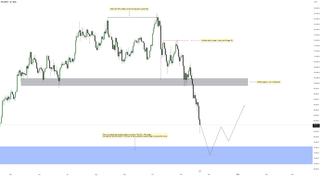 مهم‌ترین منطقه زیر قیمت حدوداً بین هفتاد و دو هزار تا هفتاد و پنج هزار قرار داره، که نزدیک‌ترین حمایت معنادار باقی‌مونده توی تایم فریم‌های بالاتره. این منطقه از آخرین فاز انباشت اصلی تا حالا تست نشده، و تا وقتی که قیمت با یه حرکت تمیز بهش برسه، واکنش میتونه پایه و اساس یه حرکت صعودی رو تشکیل بده. اگه این منطقه نتونه دووم بیاره، حمایت معنادار بعدی عمیق‌تره و افت قیمت میتونه قبل از شروع هر ریکاوری سرعت بگیره.