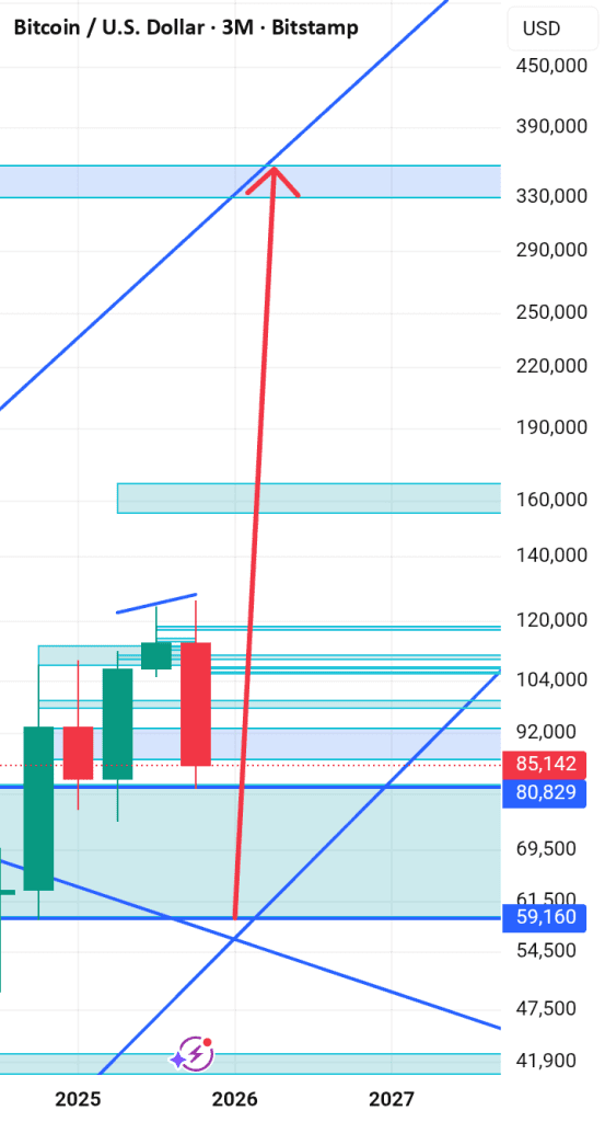 بیت کوین داره سقوط می‌کنه ولی اگه به تایم‌فریم ۳ ماهه نگاه کنیم، بازار هنوز صعودیه. انتظار دارم بیت کوین از محدوده حمایتی برگرده بالا و تا ۳۵۰ هزار دلار به ازای هر بیت کوین رشد کنه. نکته: این پیش‌بینی بلندمدت منه.