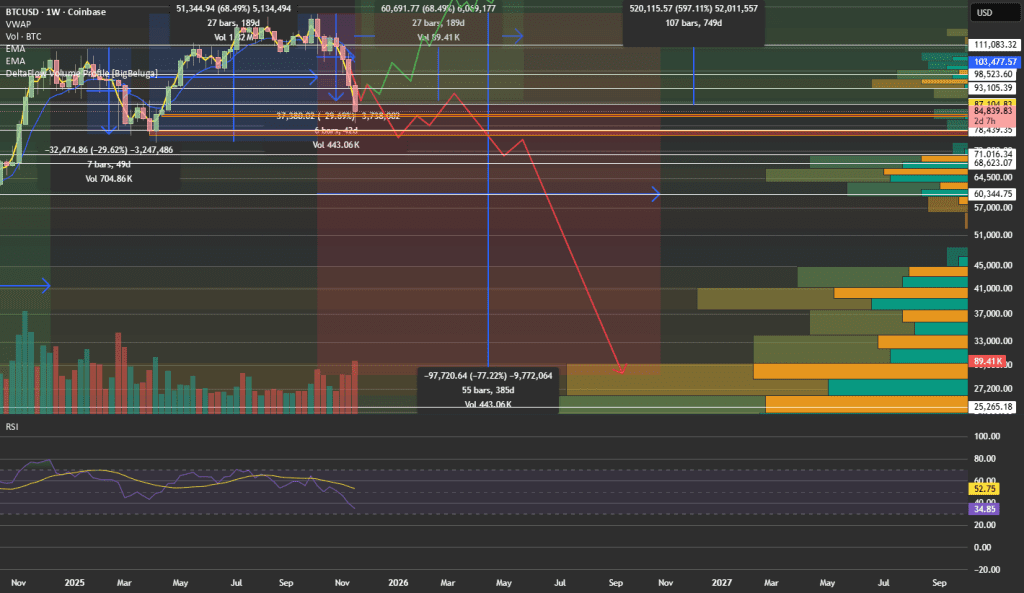 لطفاً اینو یه نگاهی بندازین و ببینین می‌تونین چیزی بهش اضافه کنین تا دقیق‌تر بشه. من واقعاً فکر می‌کنم BTC یه شاخص فوق‌العاده خرده‌فروشی در سطح کلان، هم برای نقدینگی و هم برای اعتماد هست. من شخصاً می‌بینم که BTC تو محدوده ۸۵ هزارتا میانگین میگیره و بعد تا ۷۰ هزارتای بالا و میانی میاد. این اتفاق باید تو هفته شکرگزاری بیفته چون خانواده‌ها کنار هم هستن و ترس می‌تونه خیلی سریع‌تر در مورد مدیریت دارایی و سهام پخش بشه. بعدش باید ریکاوری‌مون رو ببینیم که برمی‌گرده به سقف‌های تاریخی (ATH) که از اوایل دسامبر سه ماهه چهارم —- اواخر اکتبر سه ماهه سوم ۲۰۲۶ ادامه پیدا می‌کنه. من انتظار دارم تا آوریل تا ژوئن سال آینده ۱۴۷ هزارتا رو ببینم. اما قبل از پایان سال حتماً یه پامپ رو می‌بینیم. این فقط یه جور خارج کردن ضعیف‌ها از بازار (shakeout) هست.