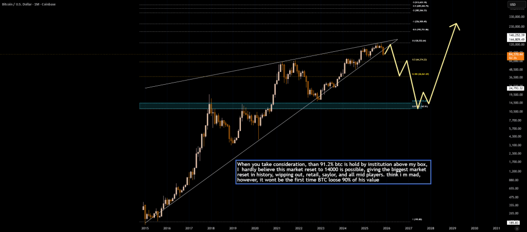 اگه در نظر بگیریم که ۹۱.۲٪ بیت کوین توسط موسسات بالاتر از اون محدوده من نگهداری میشه، به‌سختی باورم میشه که این ریست بازار تا ۱۴۰۰۰ ممکن باشه. این بزرگترین ریست بازار تو تاریخ میشه که خرده‌فروش‌ها، سیلور و همه بازیکن‌های میانی رو از بین می‌بره. شاید فکر کنید دیوونه‌ام، ولی این اولین باری نیست که بیت کوین ۹۰ درصد از ارزششو از دست میده.