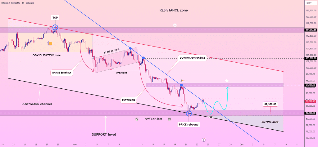 داره از محدوده حمایتی اصلی نزدیک ۸۲,۳۰۰ برمیگرده، بعد از اینکه یه حرکت کامل رو داخل کانال نزولی تکمیل کرد. قیمت الان داره به خط روند نزولی فشار میاره — سطحی که از اوایل نوامبر جلوی هر حرکت صعودی رو گرفته بود. بازار داره تو این تست دوباره یه ساختار کف بالاتر ایجاد میکنه که نشونه یه فاز اولیه انباشت هست.