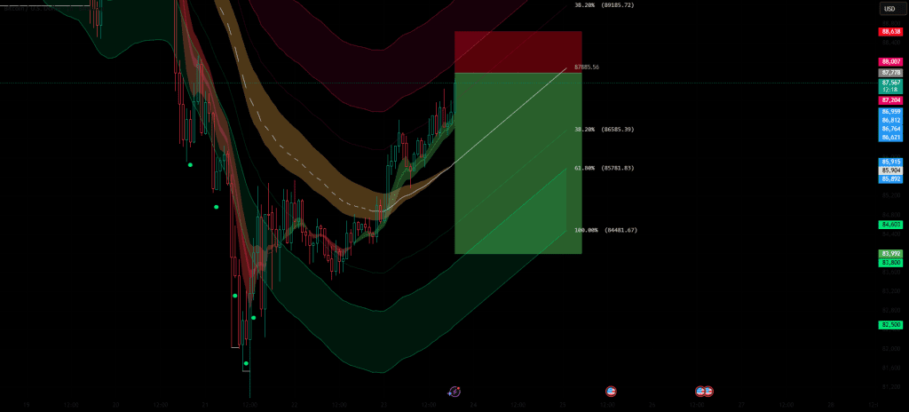 به یه منطقه مقاومت محلی نزدیک ۸۷.8k رسیده، که با باند نوسانپذیری بالا هماهنگه و داره نشانههای اولیه خستگی رو نشون میده. قیمت هم داره با سطح بازگشتی ۳۸.۲% فیبوناچی درگیر میشه، که معمولاً تو ساختارهای اصلاحی مثل یه نقطه محوری برگشتی عمل میکنه.