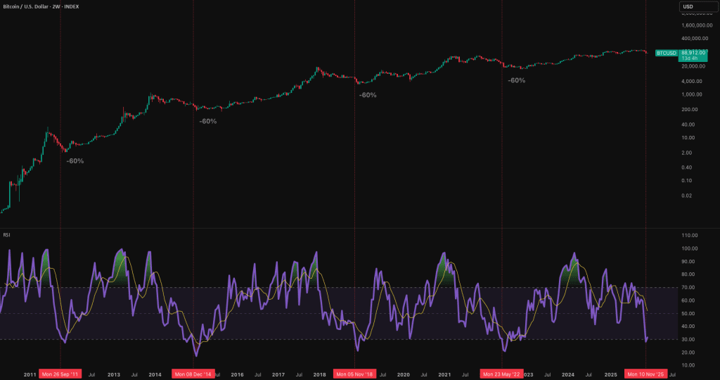RSI سهام دو هفته‌ای بیت‌کوین‌دلار (بسته شدن دوره ۱۴)