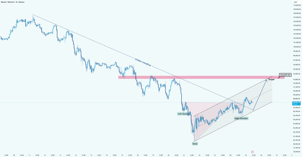 در کل، چارت از ادامه حرکت صعودی به سمت ۹۳ هزار دلار حمایت می‌کنه، مگر اینکه قیمت حمایت کانال رو بشکنه، که این موضوع چیدمان برگشتی صعودی رو ضعیف می‌کنه.