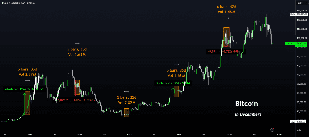 بیت کوین از نظر تاریخی، همیشه در ماههای دسامبر خیلی صعودی بوده. بیشترین افزایش رو توی سال ۲۰۲۰ دیدیم، وقتی بیت کوین بیش از ۱۴۰% رشد کرد.