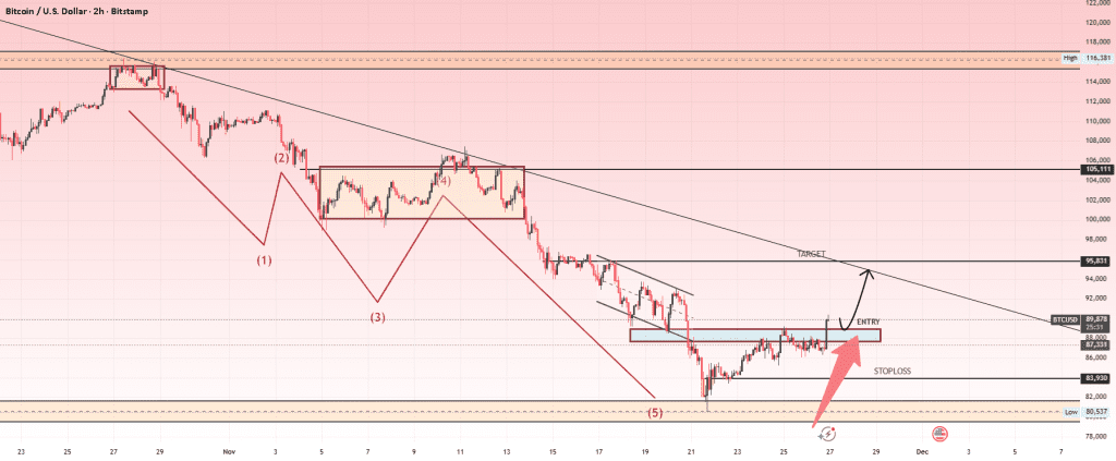 BTCUSD (۲ ساعته) – تکمیل موج الیوت + آمادهسازی برای شکست