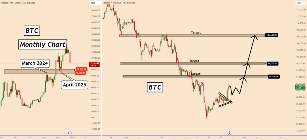 بیت کوین به یک محدوده حمایتی مهم و بلندمدت بین ۷۵,۱۰۰ تا ۸۰,۸۰۰ رسیده، ناحیهای که قبلا تو مارس ۲۰۲۴ و آوریل ۲۰۲۵ در تایم فریم ماهانه یه حمایت قوی بود.