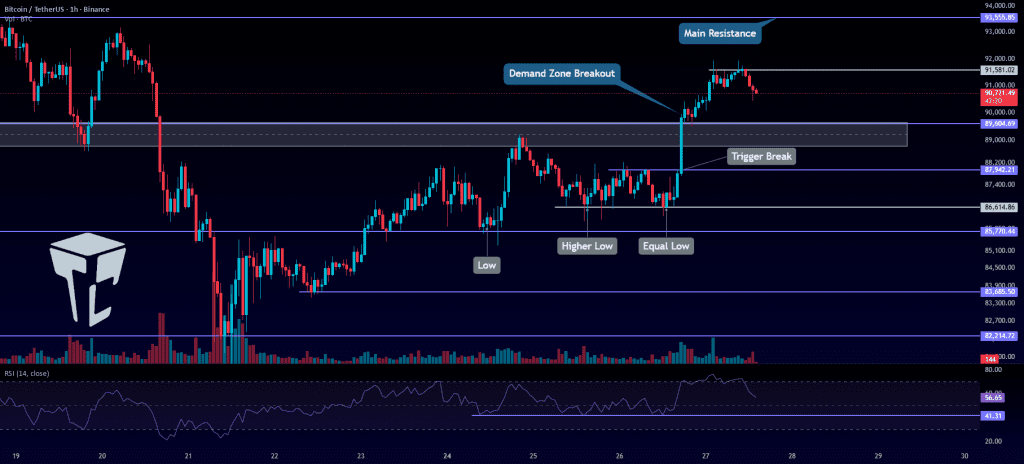 💡 الان، بعد از شکستن این سطح، قیمت یه کم ضعف نشون داده و به محدوده ۹۱,۵۸۱ واکنش داده، با اینکه RSI از منطقه اشباع خرید خارج شده.