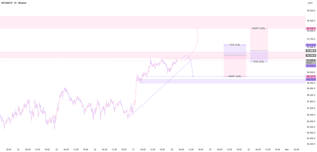 نمودار یه تنظیمات لانگ تاکتیکی رو نشون میده که حمایت حدود ۹۰,۱۰۰ تا ۹۰,۲۰۰ نقطه محوری اصلیشه؛ نگه داشتن قیمت بالای این محدوده باعث میشه روند به سمت مقاومت/هدف بالاتر نزدیک ۹۴,۵۰۰ تا ۹۵,۰۰۰ ادامه پیدا کنه، در حالی که یه شکست واضح به زیر خط روند، ساختار صعودی رو باطل میکنه و جا رو برای یه پولبک عمیقتر باز میکنه.