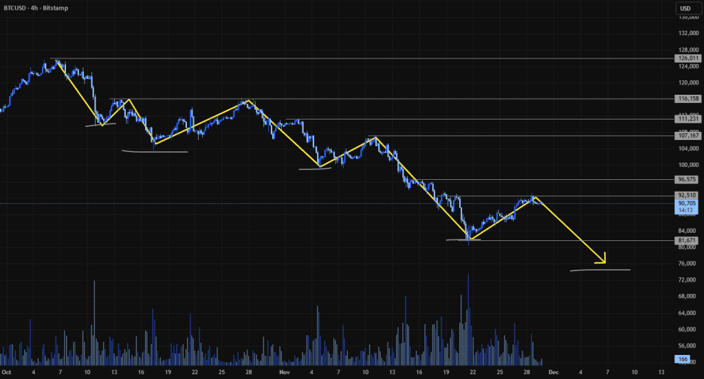 وقتی نمودار رو یه کم بزرگتر میکنیم تا دید جامعتری از شروع روند نزولی داشته باشیم، میتونیم یه **روند نزولی قوی** ببینیم. بعد از هر ریزش، قیمت اصلاح کرده و بعد دوباره به افتش ادامه داده.