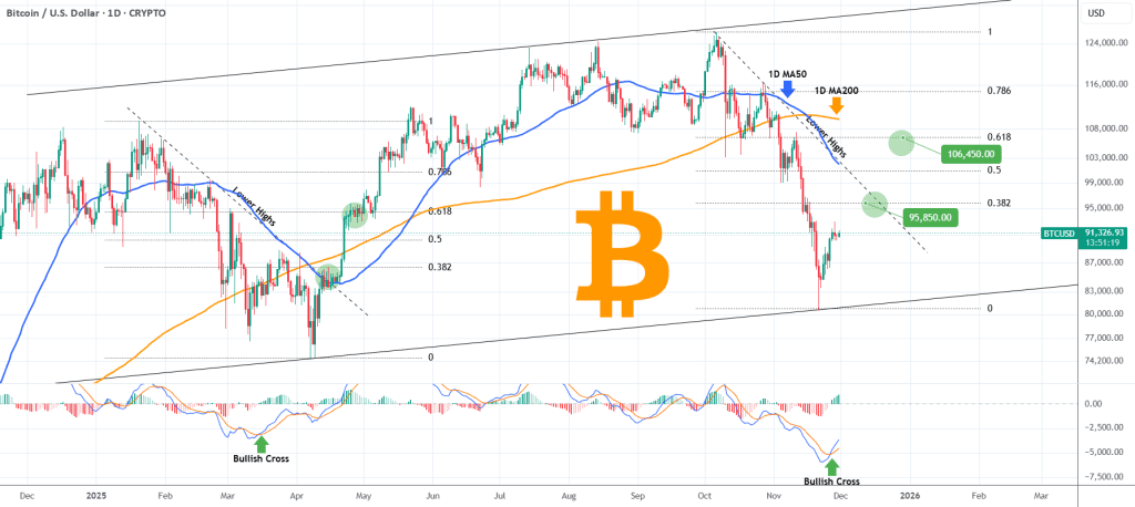 خب، حالا که مقدمه تموم شد، بریم سراغ اصل مطلب. فروش گسترده بیت کوین از زمان سقف تاریخی (ATH) ۱۲۶۴۰۰ دلاریش در ۶ اکتبر، یه پای نزولی بوده که شبیه اصلاح اصلی قبلی بین ۲۰ ژانویه تا ۷ آوریل هست. در واقع از نظر تکنیکالی به نظر می‌رسه که هر دو بخشی از یک کانال صعودی هستن. با توجه به اینکه دقیقاً مثل ماه مارس یه کراس صعودی MACD یک روزه رو هم تازه تموم کرده (هرچند اون ساختار یه کف نهایی دیگه هم زد)، به نظر میاد که اولین رالی خلاف روند این چرخه صعودی که توی ۱۰ روز گذشته در موردش صحبت کردیم، ممکنه اتفاق بیفته.