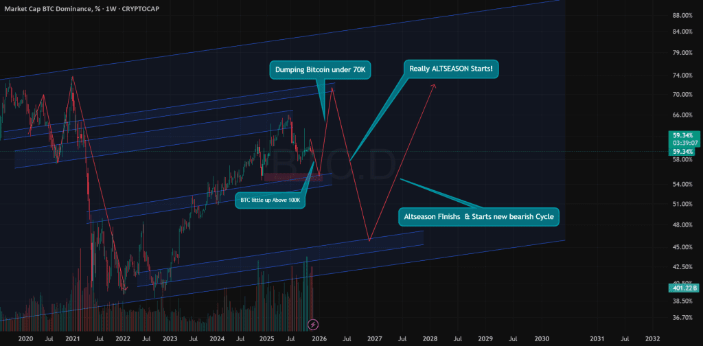 بعد، اواخر سال ۲۰۲۶، بازار کریپتو احتمالاً وارد یه روند نزولی موقت میشه، و بیت کوین کمکم دوباره کنترل کل بازار رو به دست میگیره و دامیننسش دوباره بالا میره.