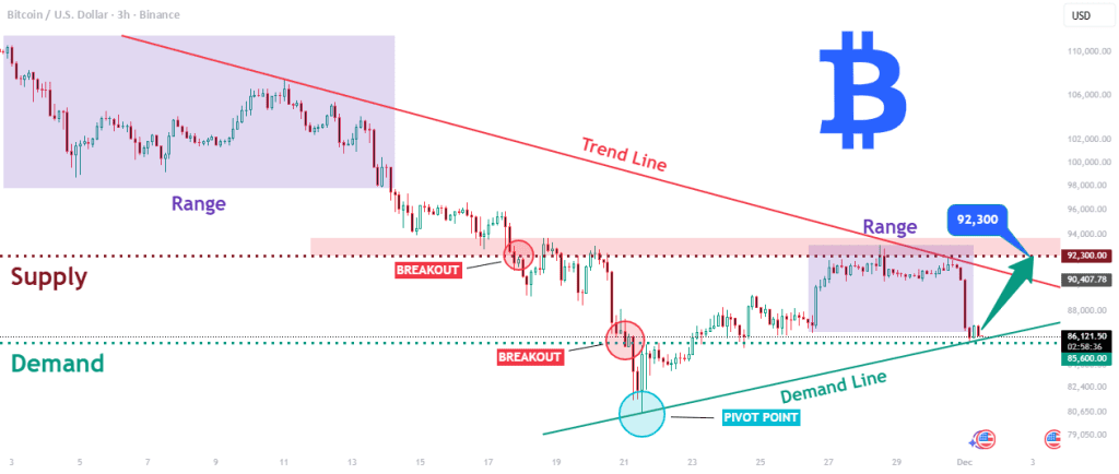 در حال حاضر، حراج تو یه نقطه عطف بحرانی قرار داره، و بیت کوین داره خط تقاضا رو نزدیک سطح تقاضای ۸۵,۶۰۰ دوباره تست میکنه. بعد از یه سری حرکتهای نوسانی داخل محدوده، قیمت داره سعی میکنه تو این حمایت ساختاری تثبیت بشه در حالی که به آرامی دوباره به خط روند نزولی نزدیک میشه. این فشرده شدن نوسانات بین عرضه و تقاضا نشون میده که یه حرکت جهتدار قابل توجه به زودی اتفاق میفته.