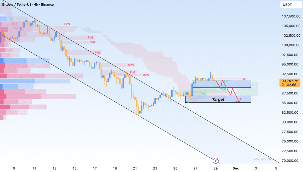 از نظر تکنیکال، FVGهای پایین‌تر در ۸۹,۵۰۰–۹۰,۰۰۰، ۸۸,۰۰۰–۸۸,۵۰۰ و ۸۶,۵۰۰–۸۷,۰۰۰ دلار آمریکا، مناطق برگشت قیمت مناسبی رو قبل از جهش بعدی فراهم می‌کنن. ساختار هنوز نتونسته سقف جدیدی رو تشکیل بده، حرکت صعودی ضعیفه و فشار فروش کمی بهبود پیدا کرده؛ این اصلاح تکنیکال فرصتیه برای بازار تا نقدینگی جمع کنه.