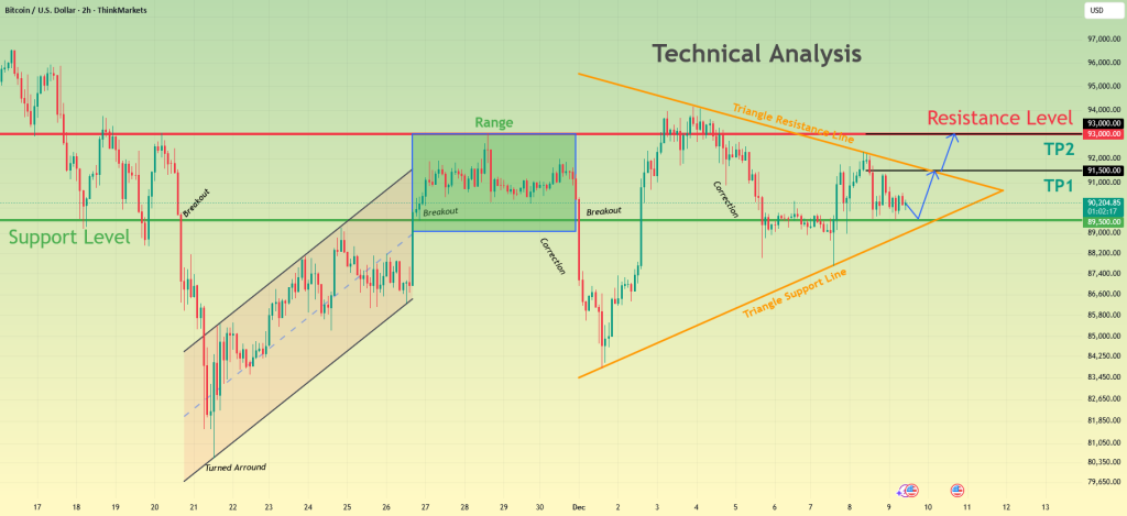 خریداران بیت کوین/دلار از حمایت دفاع می‌کنند — بازار ناحیه ۹۱.۵ هزار دلار تا ۹۳ هزار دلار رو هدف گرفته