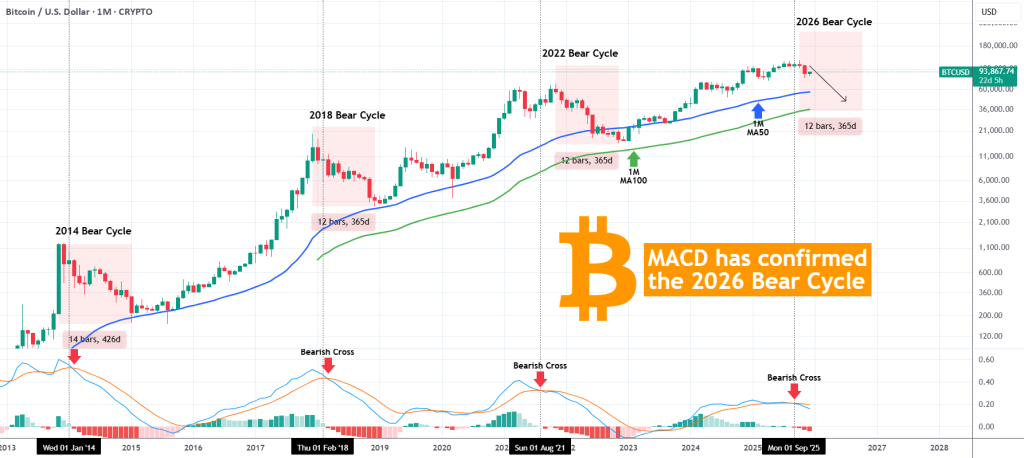 این آخرین شاخصی بود که مونده بود و حالا دیگه کاملاً واضحه. با بسته شدن کندل ماه پیش، بیت کوین (BTCUSD) تایید کرده که یک چرخه نزولی (Bear Cycle) جدید رو شروع کرده.