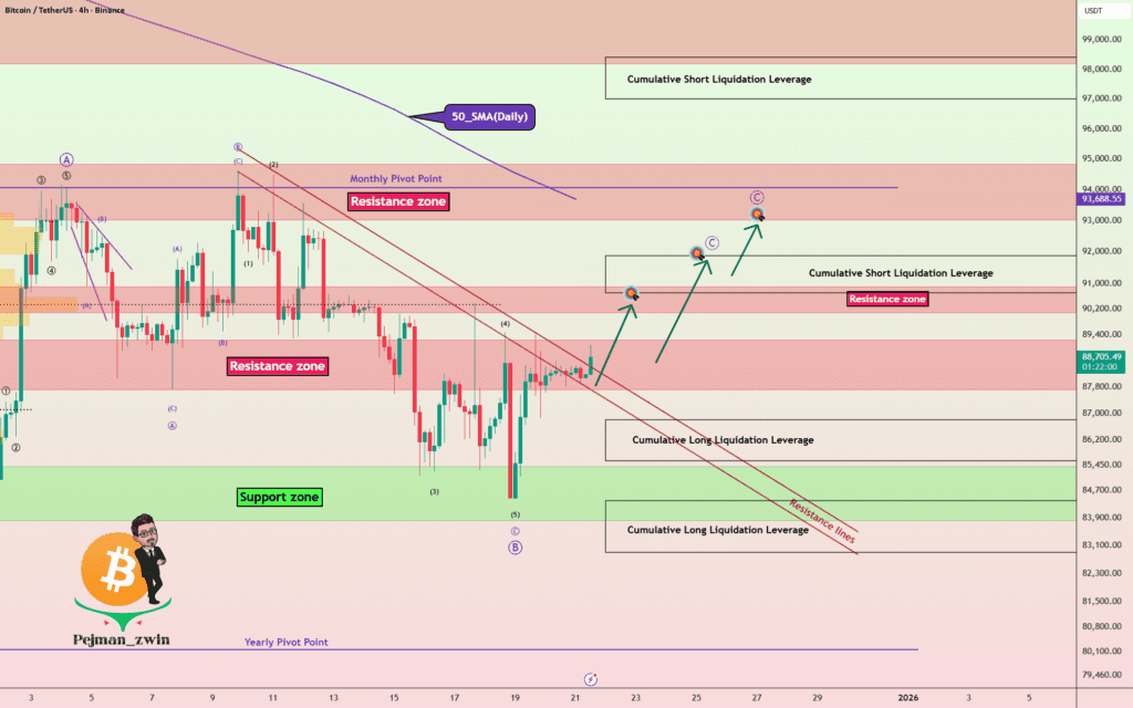 بر اساس این همگرایی، انتظار دارم بیت کوین با موفقیت از ناحیه مقاومت ($۸۹,۲۳۰-$۸۷,۷۲۰) عبور کنه و احتمالاً به سمت سطح $۹۰,۲۱۷ به عنوان حداقل هدف صعودی حرکت کنه.