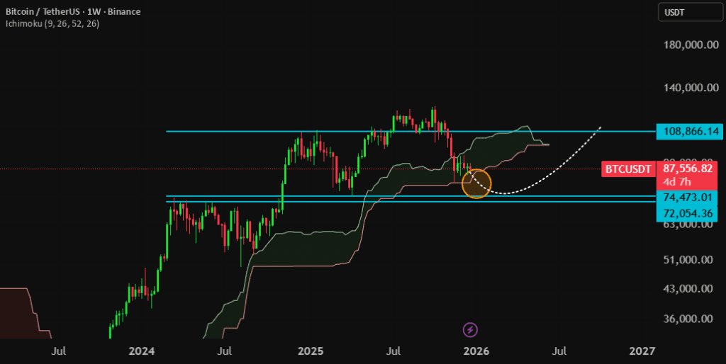 از دید تکنیکال، واکنش تایمفریم هفتگی به حمایت کومو (سنکو اسپن B) یه سطح کلیدی برای رصده. اگه این ناحیه به عنوان یه تغییر نقش از مقاومت به حمایت تایید بشه، ساختار صعودی بلندمدت رو قویتر میکنه. تو این سناریو، بیت کوین میتونه روند صعودی خودش رو از سر بگیره و احتمالا تو سال ۲۰۲۶، یا حتی زودتر تو ماههای اول سال، به سطوح بالاتری برسه.
