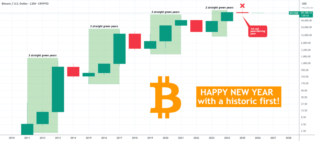 بیت کوین (BTCUSD) سال رو با یه کاری تموم کرد که از لحاظ تاریخی هیچوقت قبلاً انجام نداده بود. و اون اینه که یک سال رو توی چرخه صعودی (Bull Cycle) با ضرر (قرمز) به پایان رسوند.