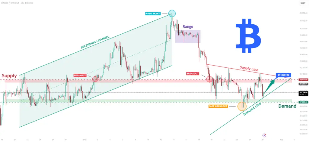 در حال حاضر، BTC داره از منطقه تقاضا ریکاوری میکنه و در امتداد یه خط تقاضای صعودی بالاتر میره، در حالی که داره به سطح عرضه قبلی نزدیک ۸۹,۸۰۰ میرسه. پرایس اکشن نشوندهنده یه ریکاوری اصلاحی هست تا یه برگشت روند کامل، با خریدارانی که دارن سعی میکنن ساختار کلیدی رو پس بگیرن. منطقه حدود ۸۹,۸۰۰ دلار الان به عنوان یه منطقه تصمیمگیری حیاتی عمل میکنه، جایی که پذیرش یا رد بازار احتمالاً حرکت جهتدار بعدی رو مشخص میکنه.