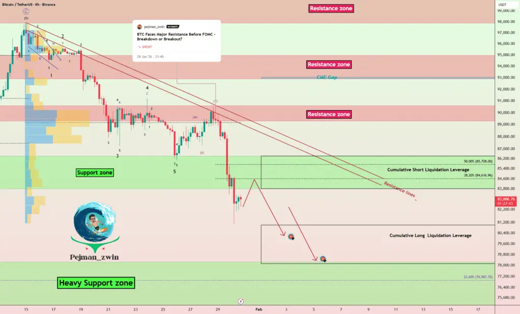 انتظار دارم که به محض ورود بیت کوین به منطقه Cumulative Short Liquidation Leverage (۸۶,۲۴۰ تا ۸۴,۸۵۰ دلار)، ممکنه تا حدود ۸۰,۲۷۳ دلار کاهش پیدا کنه. اگه مومنتوم نزولی ادامه پیدا کنه، میتونیم تارگتهای پایینتری هم ببینیم.