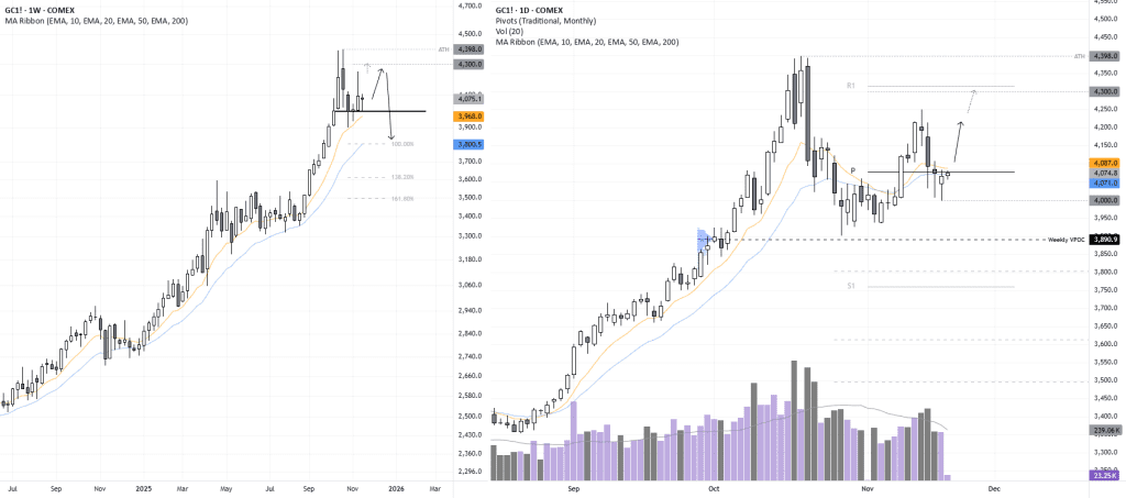 طلا از اوج هفته پیش پایینتر اومده، ولی فعلاً بالای ۴۰۰۰ مونده. دو پین بار صعودی هم توی نمودار روزانه شکل گرفته که نشونه یه کف نوسانی احتمالیه. اگه از سقف دیروز رد بشه، ممکنه گاوها ۴۲۰۰ رو هدف بگیرن، و با رد شدن از سقف ۴۲۵۰، ۴۳۰۰ و S1 ماهانه هم تو دسترس قرار میگیره.