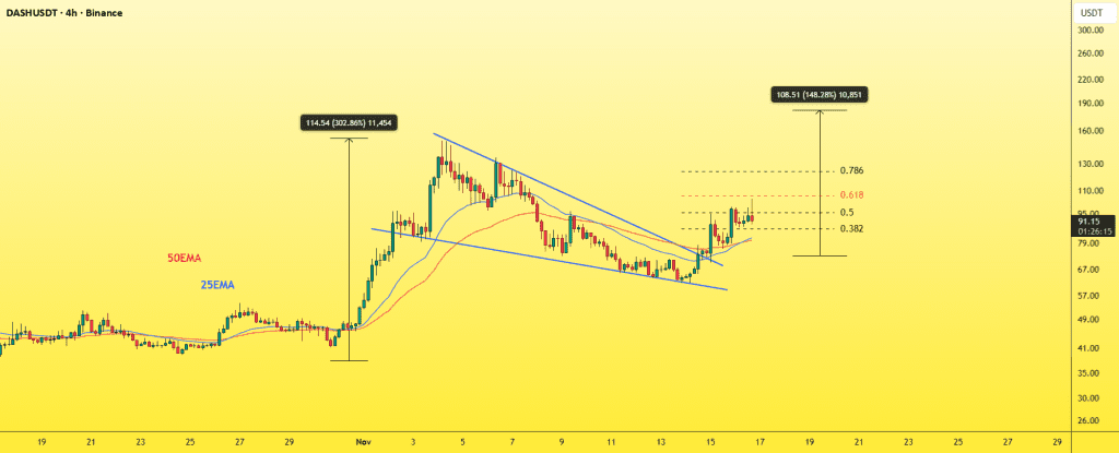دَش توی چند هفته اخیر بیشتر از ۳۰۰٪ رشد کرده و الان تو یه اصلاح قیمت سالمه. یه ناحیه تثبیت قیمت و یه الگوی کنج ریزشی تشکیل داده بود که اونو شکسته و با موفقیت هم پولبک زده. دوباره داره شروع به رشد می‌کنه.