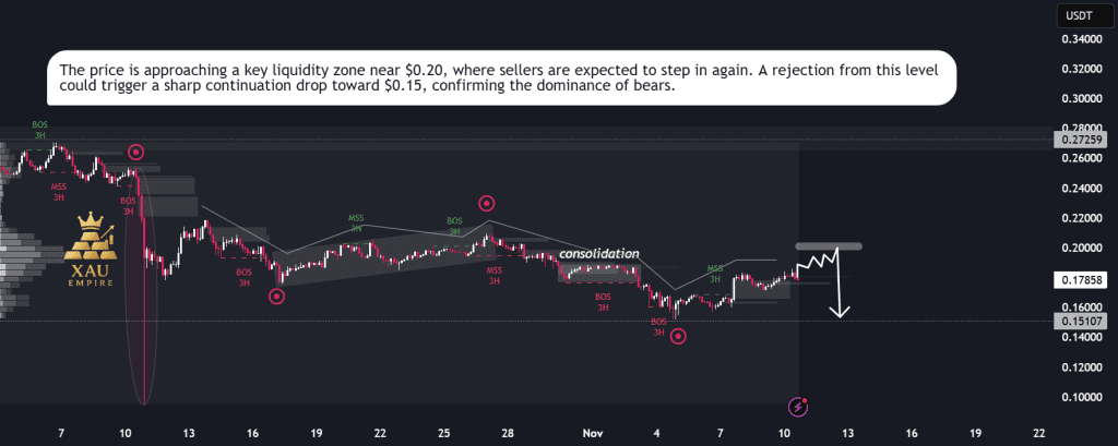 در حال حاضر، DOGEUSDT داره یه اصلاح صعودی کوچیک رو امتحان میکنه، احتمالا برای تست مجدد ناحیه عرضه ۰.۲۰ دلار — یه ناحیهای که ممکنه قبل از حرکت نزولی اصلی بعدی، به عنوان یه دام نقدینگی عمل کنه. اگه قیمت نتونه بالای اون ناحیه بمونه، ممکنه بازار یه افت شدید به سمت سطح ۰.۱۵ دلار رو فعال کنه و ادامه روند نزولی بزرگتر رو تایید کنه.